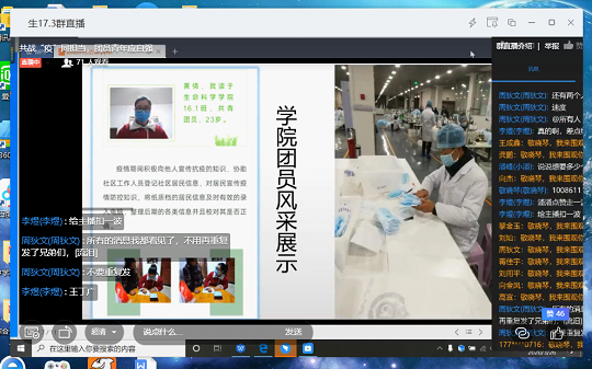 2017级3班生活会伊始,主讲人敬晓琴同学带领全体同学学习了“共青团中央关于在重点领域组建疫情防控青年突击队投身防控疫情阻击战的工作指引”,并且她呼吁同学们在对党和国家要有信心的同时,还要积极参与到抗疫斗争当中去。敬晓琴还向大家展示了部分同学在疫情期间做志愿者的照片,鼓励同学们积极参与到抗击疫情工作当中。最后,同学们在评论区纷纷表达了对抗击疫情的一些想法和祝福,同学们坚信只要勠力同心,定能打赢这场疫情防控的攻坚战,阻击战。