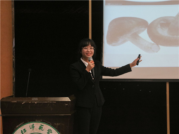 谢萍同学以“蔬菜之魁是什么?”这个问题为演讲起点,让大家进行思考,提出自己的想法,随后又用一组“表情包”引出了主题——蘑菇,之后以提问的形式带领着现场观众走进了蘑菇的世界。谢萍同学分别从蘑菇的外形、营养价值以及实际应用等方面来向大家进行介绍,随后又以短视频的形式向大家介绍了蘑菇主要的生长环境。她主讲了“猴头菇”与“毒蘑菇”,并提到了“猴头菇’的研究方向和“毒蘑菇”的鉴别方法。