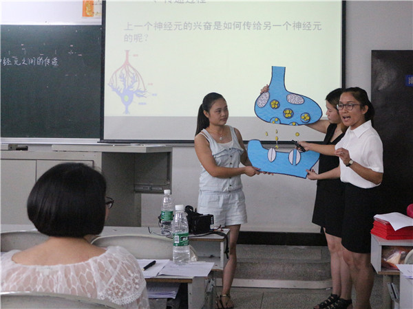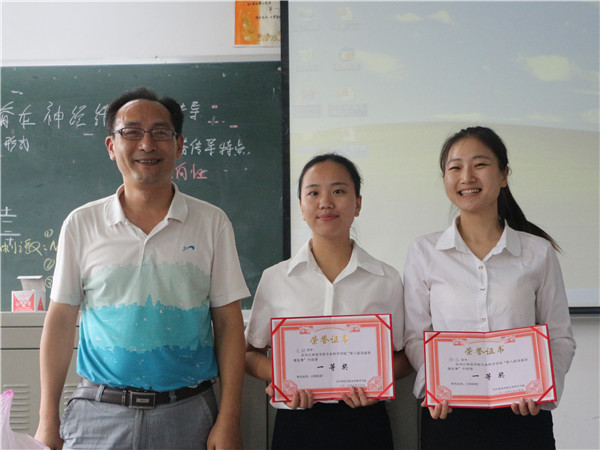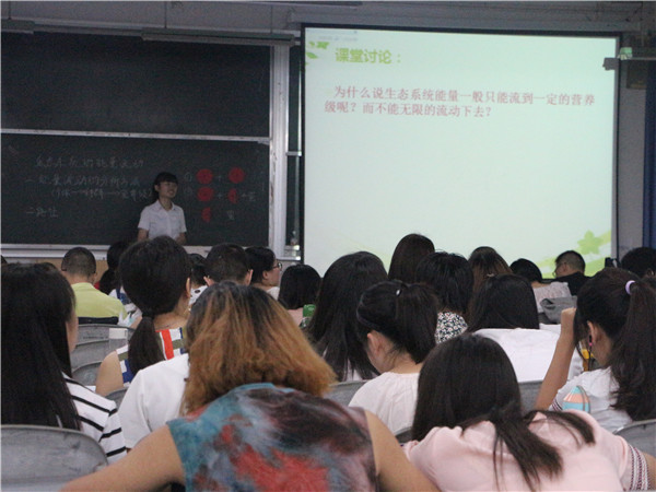 在主持人向霞简单介绍完比赛内容后,第一位参赛者丁前霞走上讲台,为大家带来了精彩的说课讲课。讲课过程中,她用PPT与板书相结合具体对神经调节这一节内容进行了讲解。为了让大家更好的体会反射条件,她展示了拳击比赛的图片,同时选取一名观众现场表演。在她的说课讲课结束后,由现场评委老师对其进行了点评。紧接着,一个又一个的参赛者依次上台大展身手,风趣幽默的说话方式,形象生动的道具表演,师生间精彩的互动将同学们的注意力都牢牢吸引住了,整个教室的气氛都被带动了起来。经过5个多小时激烈的比赛,此次说课讲课也告一段落,最后由内江六中的吴英老师为这次比赛进行了精彩的点评,随后也请上了教学指导委员会的邹万全老师为此次比赛指导,邹老师首先肯定了同学们的能力,个个都是优秀的,但在比赛中仍存在不足,希望同学们在平时的说课讲课练习中,多听取听课者的意见,并希望他们在日后的学习和生活中更好的完善自己,提高个人的教学素质及师范技能。