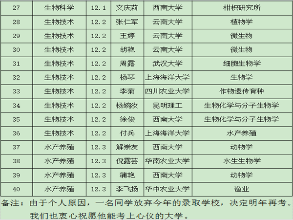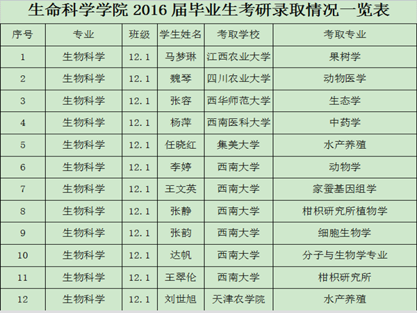 2016年公司共有本科毕业生122人,其中高职33人,报名考研50人,实际参考49人,其中高职2人,上线人数41人,并最终全部被四川大学、武汉大学、西南大学等近20所知名高校录取。其中生物科学专业两个女生寝室因同寝室姐妹全部考上研究生而成为公司“考研明星寝室”,受到公司的专题报道,在全校引起强烈反响。