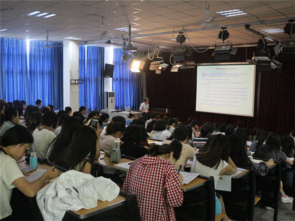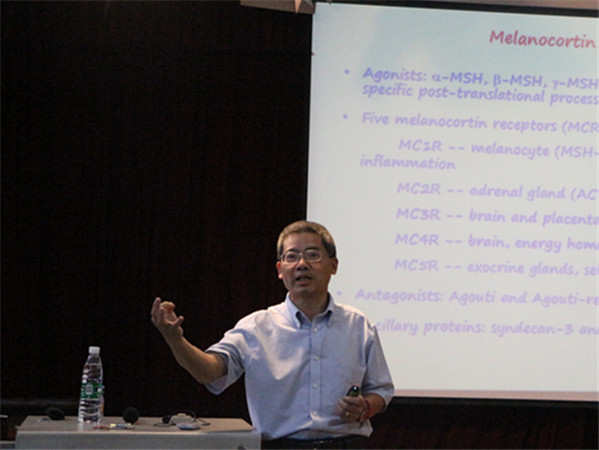 在讲座开始之前,谢碧文教授简单介绍了陶亚雄教授,并对陶教授的到来表示热烈的欢迎。陶教授一上讲台就主宰了整个课堂,同学们的目光都被他吸引住了。一张漫画路标直观的反映了现代人的肥胖问题。根据这一问题,陶教授又为我们讲到了白种人的肤色,白种人因为缺乏一种酶,相应的色素也难以合成,于是便有白种人晒不黑一说。紧接着陶教授讲到负反馈对机体稳态的作用,虽然他制作的PPT是全英文,但丝毫不影响同学们对知识的渴望。随后陶教授重点讲了MC4R,其中最让大家印象深刻的是教授讲到的国外正在研究的一种根据基因突变不同造成疾病也不同的治疗方案。同时就女生最关心的肥胖问题,陶教授提出了四个字——积少成多,真是直戳其要害。最后在场同学就以上所讲的内容提出了一些问题,陶教授一一为大家解答。