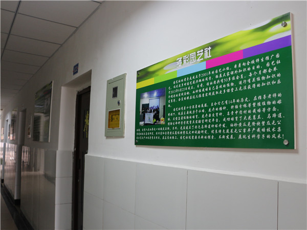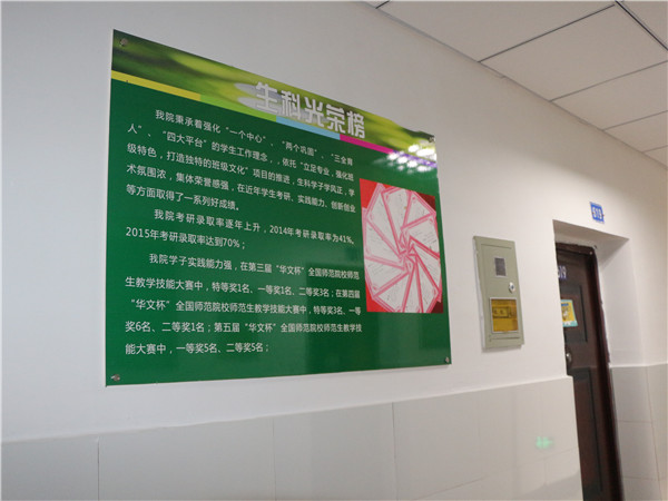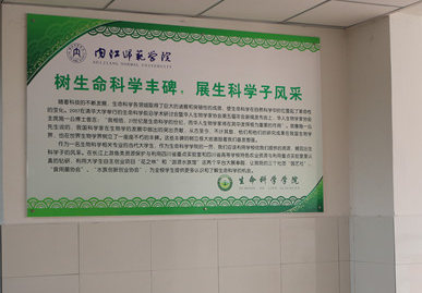 为进一步巩固寝室文化建设成果,今年十月份,公司着手开始了寝室文化长廊的建设活动。此次寝室文化长廊位于女生宿舍24幢6楼,走廊主题是“树生命科学丰碑,展生科学子风彩”。在文化长廊中,利用文化制度牌介绍了生命科学的起源、重要性及中国十大生物学家、中国药学家的事迹。同时也在其中展现了公司学子利用公司提供的资源,在“长江中上游鱼类资源保护与利用四川省重点实验室”和“四川省高等公司特色农业资源与利用重点实验室”里认真钻研的科研精神,以及“花之林”和“游源水族馆”两个团体在老员工自主创业项目这个平台上,大展拳脚,入选校园“创新创业项目”的事迹。重点宣传了公司的“园艺社”、“食用菌协会”及“水族创业协会”三个社团协会的特色文化。生科光荣板上逐年增长的考研率及“全国师范院校师范技能大赛”上获得的各种证书,无不展现着公司学子的风彩。