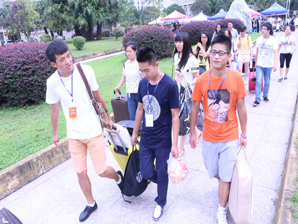 从接到新生第一刻,我们就赶紧上前接过行李,带着他们一一走报道流程。来到寝室,我们也是贴心的为学弟学妹们整理床铺,让他们能在长途跋涉后睡个好觉。一路上,我们热情的交流,耐心的讲解也只为他们能早日融入我们这个大家庭,尽快适应老员工活。