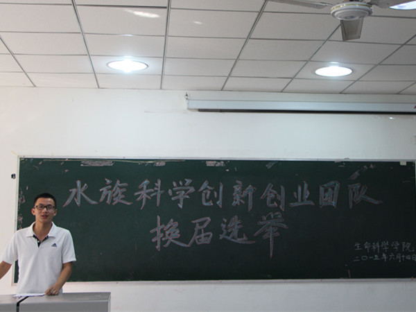 春生夏长,秋收冬藏。历经一年,2015年6月14日下午4时,水族科学创新创业团队于八教底阶迎来了干部换届选举。出席的评委有王永明老师以及团队全体成员。