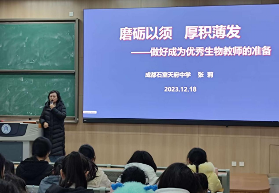 来自成都石室天府中员工物学高级老师张莉老师,给员工作了“磨砺以须、厚积薄发——做好成为优秀生物教师的准备”的主题讲座。讲座中,张莉老师围绕“优秀生物教师的样态”,从备课上课的各环节,展示了如何精心准备教学资源、进行教学设计以及指导竞赛等做法,给了员工很大触动。张老师讲座中的常用词“自己做的”,让员工感受到张老师对教学的热爱以及对教学的钻研精神和精益求精的态度。23级3班的袁宇橦同学说,听了张老师的讲座,明白了做一名好老师要“磨砺以须,厚积薄发”;23级2班的刘敏同学说,懂得了将实验融入课程的意义。