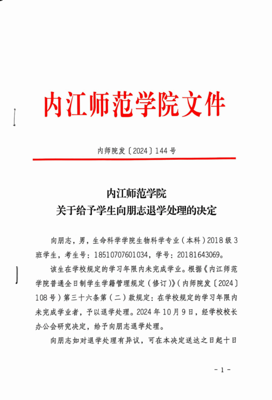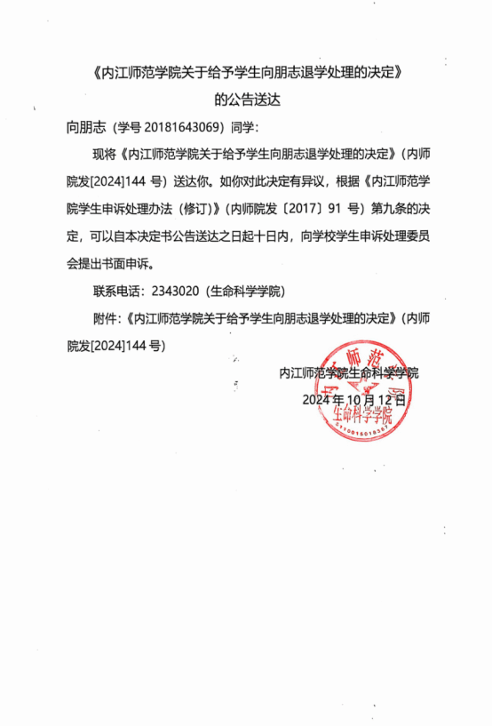 太阳网集团tcy8722关于给予员工向朋志退学处理的决定