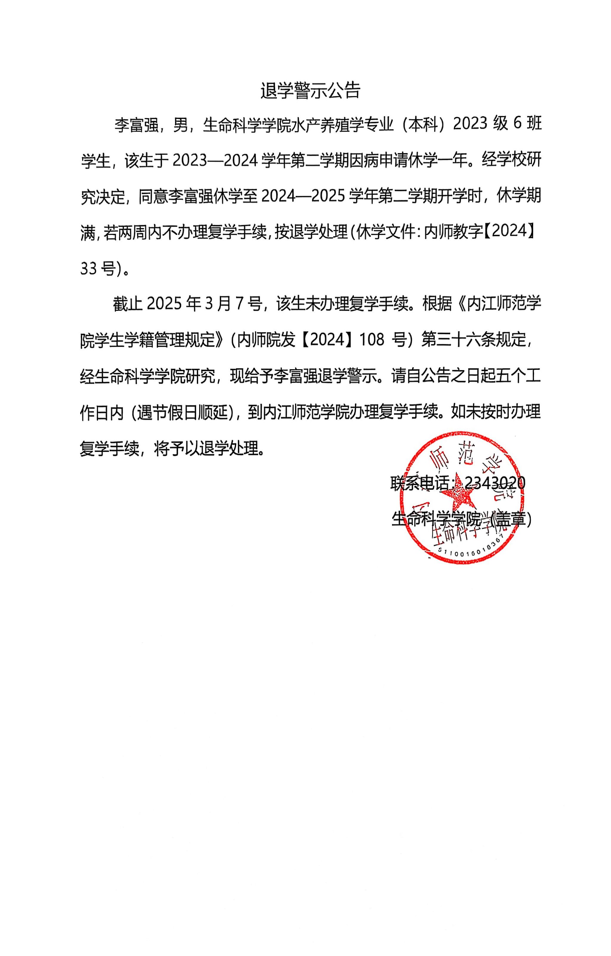退学警示公告