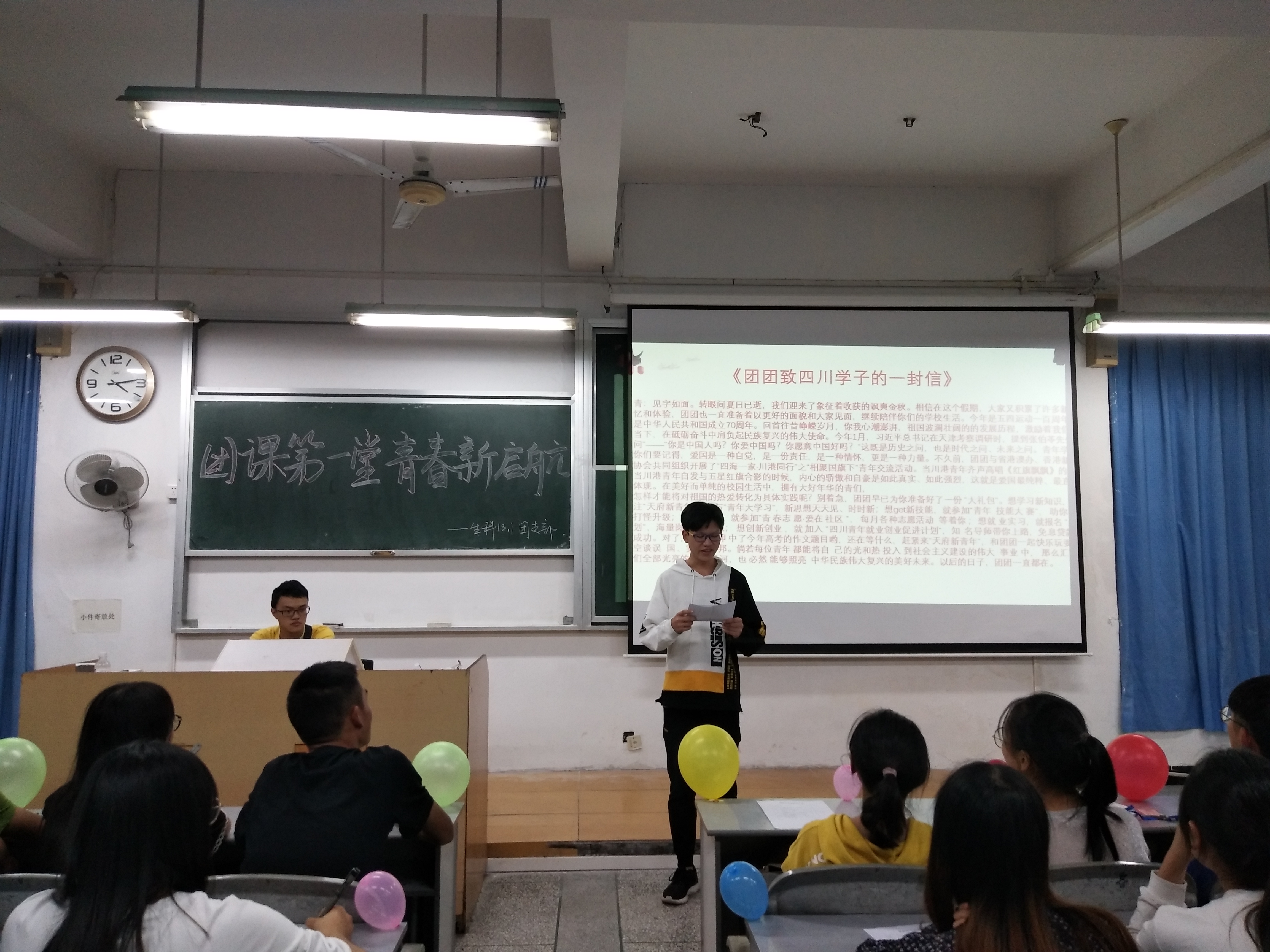 公司各同学以各种形式来表现了团课对当代老员工的重要性,如诗歌朗诵、合唱团歌、视频观看等形式。2018级3班9月22日晚上7点在八教底阶一开展了以“团课第一堂,青春新启航”为主题的团组织生活会。生活会开始全班同学齐唱《共青团团歌》,大家激情奋昂,气势如虹的歌声令人振奋,随后由翁泽鵾同学给全班阅读《团团致四川学子的一封信》,让大家感受到团组织对青少年的期望与信任,接着是由谢伟等几名同学合唱了《强军战歌》,他们用这首歌来体现了当代铁血男儿对团组织坚定不移的信念,接下来主持人组织全班同学观看了视频《与组织共命运