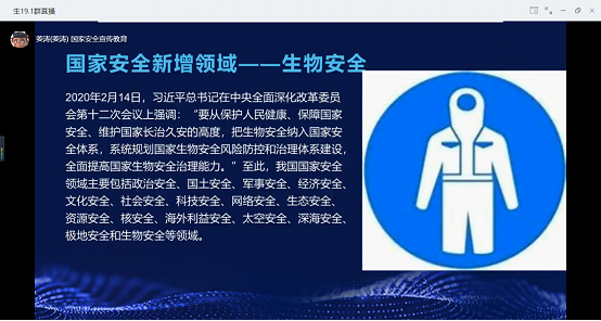 公司各班于2020年4月15日前后通过网络办公软件钉钉开展了“国家安全教育班会”的主题班会,此次班会由各班主任及各位班委干部主讲,全员参与。公司师生积极响应、高度重视,通过统筹安排、广泛动员,精心组织实施“全民国家安全教育日”主题系列活动,深入宣传以习近平同志为核心的党中央关于疫情防控工作的决策部署,充分体现我们党把人民群众生命安全和身体健康放在第一位的理念立场,提升了公司员工的国家安全意识,强化生物安全、生态安全责任意识。同时此次活动还结合了公司生命科学专业背景特点,突出公共卫生安全、生物安全等宣传教育内容,充分调动广大师生的积极性、主动性和创造性,把课堂教学与实践教育活动相结合,不断充实教育内容。公司还动员了各班级、团支部的同学积极分享学习心得,结合生物学科的知识背景,重点分享对于生物安全的理解和思考,增强维护国家安全和生物安全的使命感。